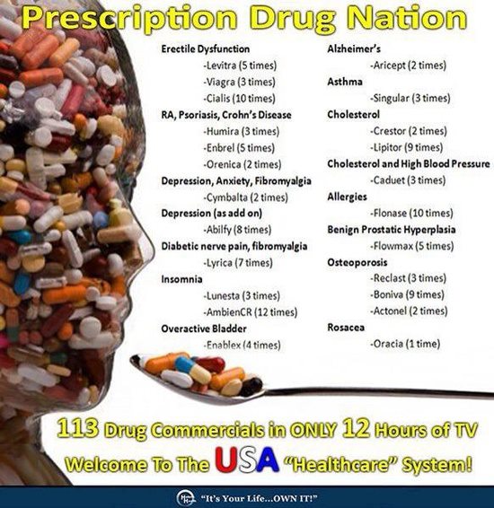 money and power of the drug company/Big Medicine complex is poured towards brainwashing Americans into swallowing (pun intended) the ridiculous assumption that if they take the right drug, their pain and suffering will go away and they will live happy and healthy lives (as long as they take their medication). Because of the propaganda they force on us through prime time television, many Americans believe that taking whatever meds their doctor prescribes them is the only way to get or stay healthy – despite the awful list of side effects of many of these drugs, including huge financial sacrifices for many individuals and families to pay for them. And with these prime time drug ads the last “thought” we are left with is “ask your doctor”. What doctor isn’t willing to write a script for the latest drug adding to his/her sales record for the local pharmaceutical rep to tally?