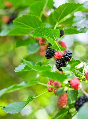 Mulberry, also known as Morus fruit, comes from the same tree used to raise silkworms, where the worms feed off the plant’s leaves. The fruit is an aggregate fruit composed of many smaller fruits called drupes. Mulberries are not actually berries. The skin is smooth and fragile but as the fruit ripens, the color changes from green to red to dark purple. White mulberry trees also exist and are the ones used for silkworms. When picked from the tree, mulberries have a stem attached which distinguishes them from blackberries and raspberries.